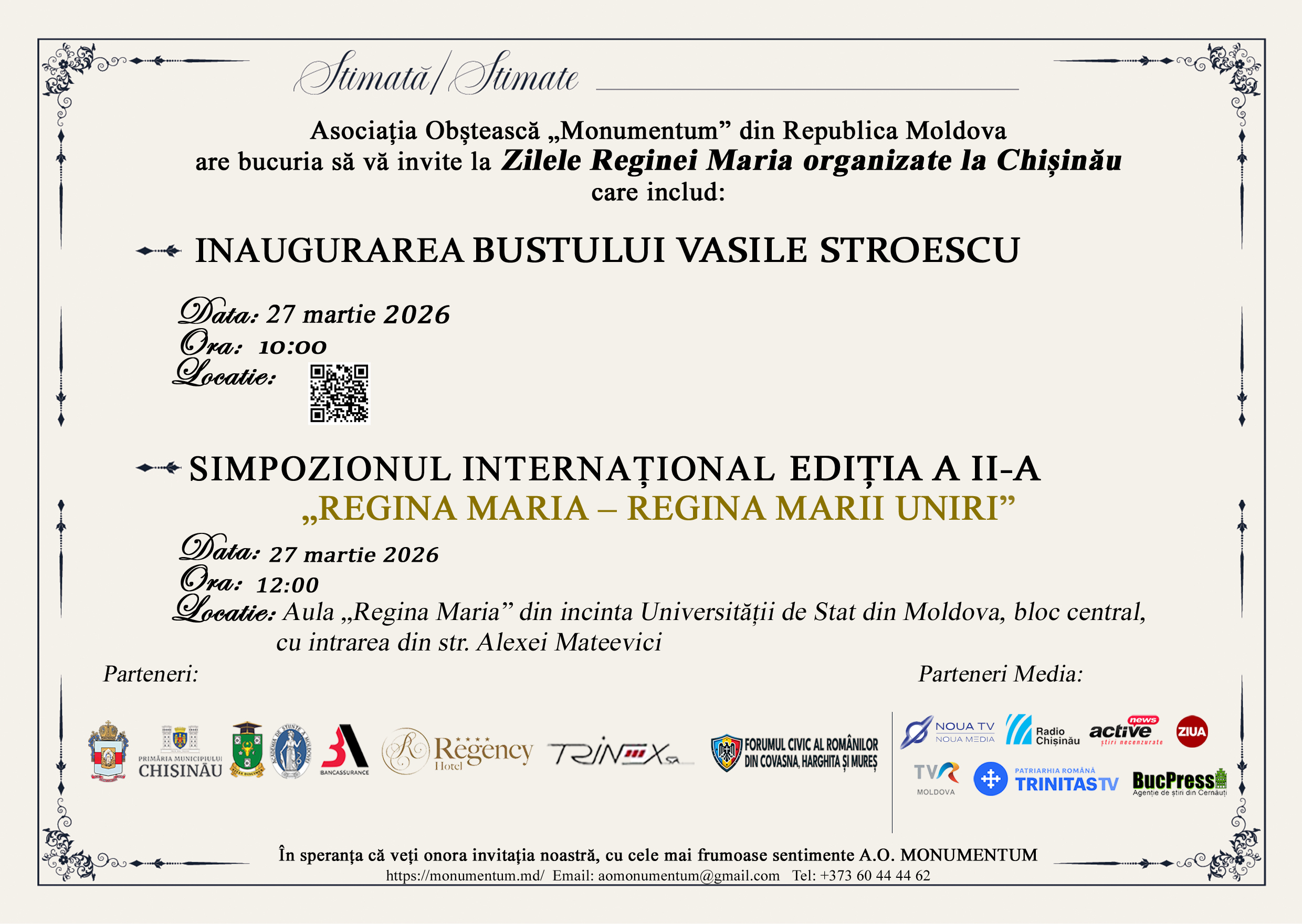 În ziua de 27 martie 2026, cu începere de la ora 12.00, în incinta Aulei „Regina Maria” din cadrul USM (Bloc central, cu intrarea din str. Alexei Mateevici, mun. Chișinău) va avea loc a doua ediție a Simpozionului internațional „Regina Maria – Regina Marii Uniri”.